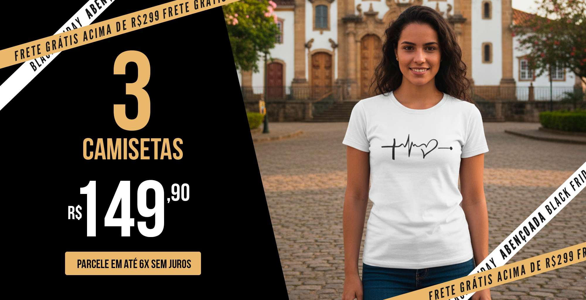 sem juros3 por 149,90Camiseta Regular - Crucifixo e Coração 2 - Preta com detalhes brancos