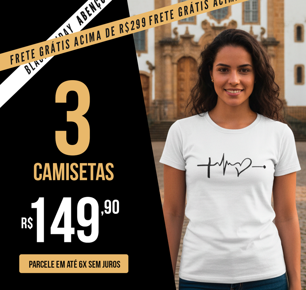 sem juros3 por 149,90Camiseta Regular - Foco Força Fé - Preta com detalhes brancos